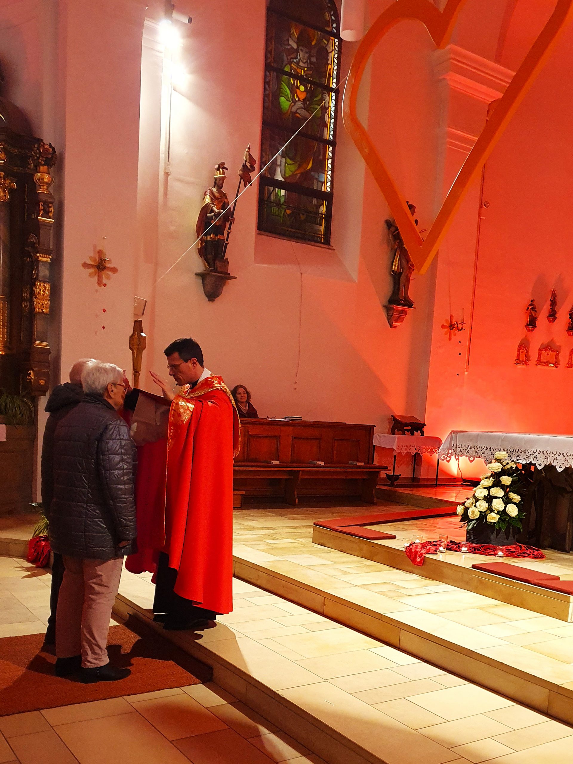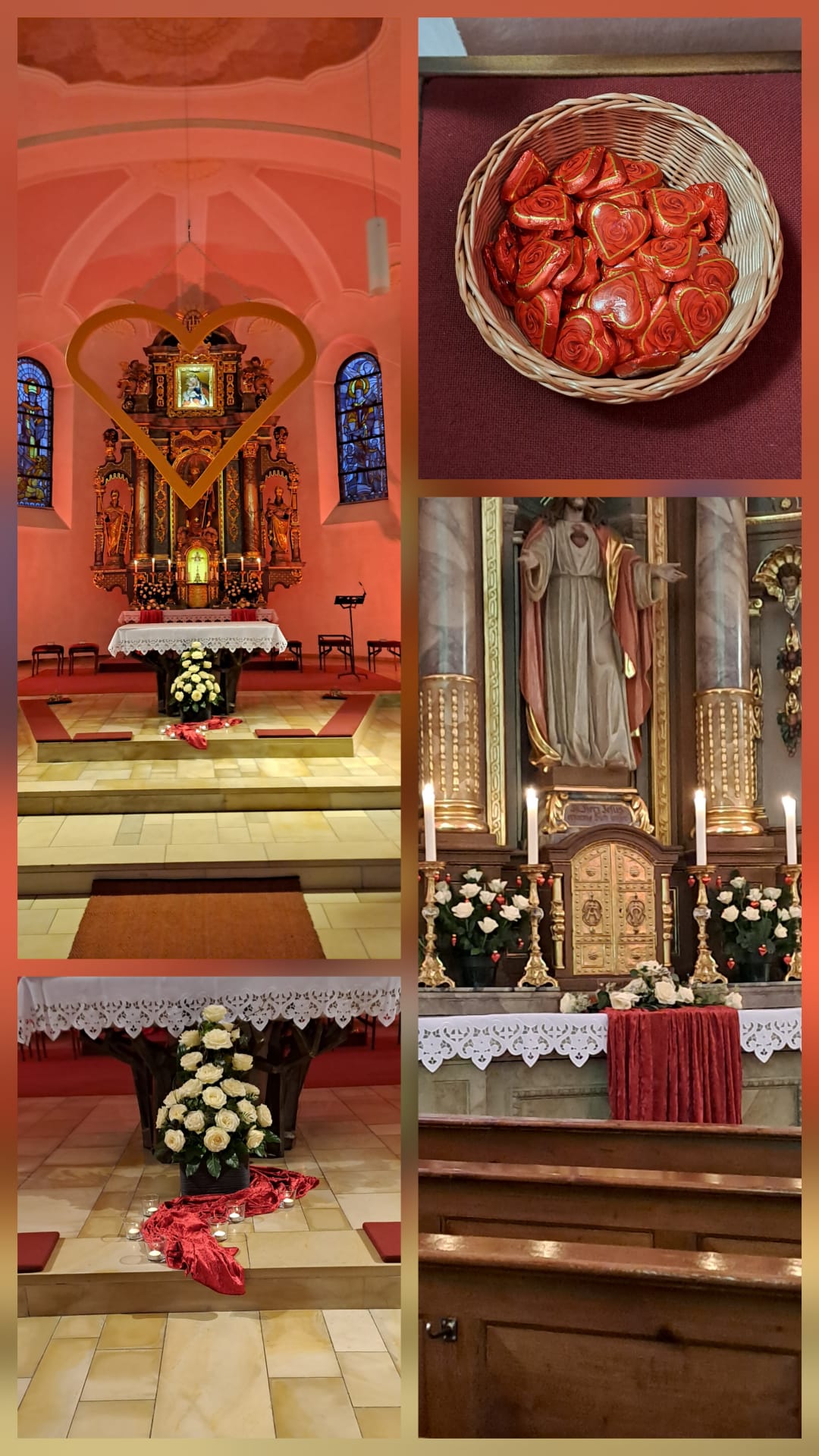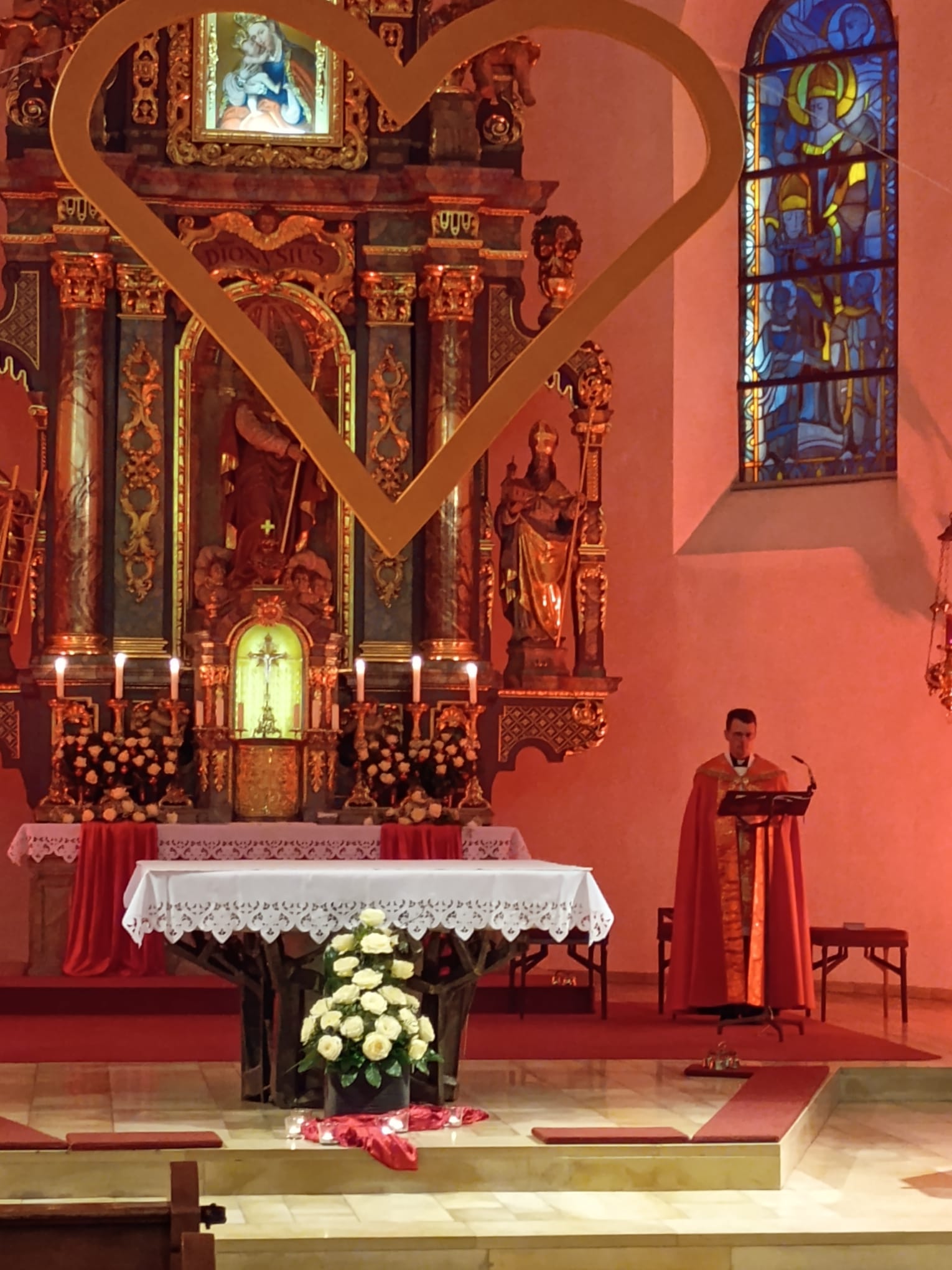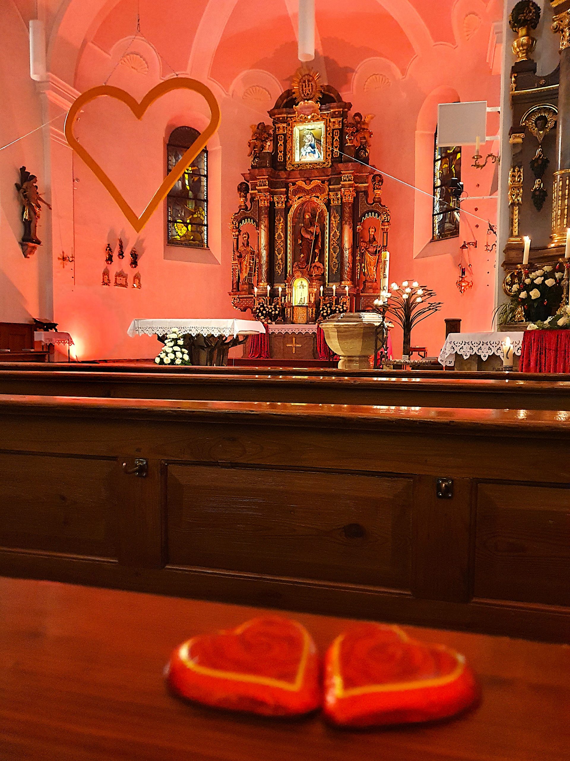 Viele Paare feiern am Valentinstag ihre Liebe mit Blumen oder einem schönen Essen. Andere holen sich lieber den Segen Gottes für die Zukunft ihrer Beziehung. Dazu bot Pfarrer Thomas Kohlhepp am Samstag Abend das erste Mal einen Wortgottesdienst für Verliebte und auch für Einzelpersonen in St. Dionysius in Neunkirchen an. Den Altarraum schmückte ein großes Herz und war in ein warmes Licht gehüllt. Viele kleine Herzen leuchteten aus dem Blumenschmuck an den Altären. Am Valentinstag feiert man die Liebe in all ihren Formen, indem sich Eheleute, Partner und Paare, Freunde und Familie gegenseitig ihre Zuneigung durch Geschenke oder Blumen zeigen. [...]