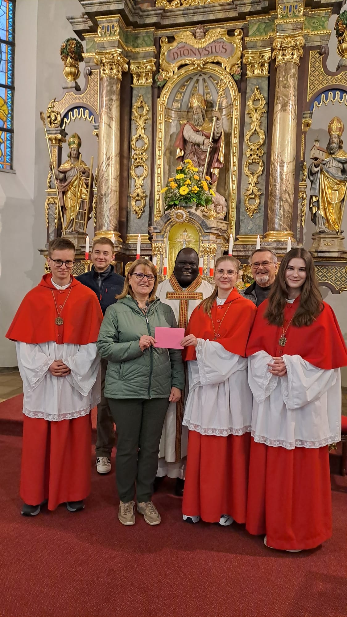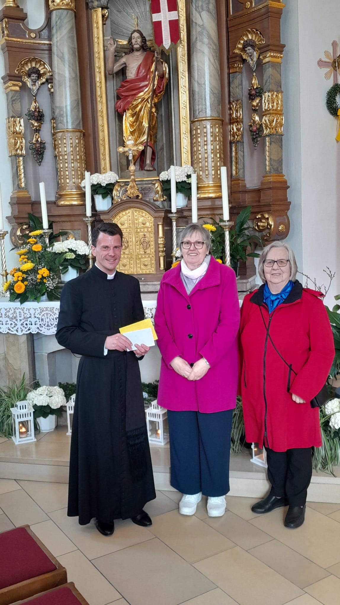 Am Ostermontag konnten Regina Völkl und Franziska Stich an Pfr. Kohlhepp den Erlös von 135,-- € aus dem Palmbuschenverkauf in diesem Jahr übergeben. Die Frauengruppe hatte diese in der Woche vor dem Palmsonntag liebevoll gebunden und gegen eine Spende angeboten. Die Pfarrkirche St. Dionysius erstrahlte auch an Ostern wieder in einem wunderbaren Blumenschmuck. Die Spende der Frauengruppe möchte daher einen Beitrag dazu leisten. Erfreulicherweise konnten auch noch einige private Spenden an Pfr. Kohlhepp weitergeleitet werden. Er bedankte sich für die finanzielle Unterstützung. Bild & Text: Regina Völkl