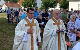Auf der Festwiese neben der Schlosskapelle feierte unsere Schwesterpfarrei St. Peter und Paul am Hochfest Maria Himmelfahrt das Patrozinium in Steinfels. Pfarrer Kohlhepp hatte als Festprediger den Stadtpfarrer Ludwig Gradl aus Amberg eingeladen, in dessen Pfarrgemeinde er selbst einige Jahre als Kaplan gearbeitet hat. Im Anschluss an den Festgottesdienst bewirteten die ehrenamtlichen Mitarbeiter der Gremien mit der Unterstützung der Mesner und der Kolpingsfamilie Mantel die Gäste mit Bratwurstsemmeln und Getränken.