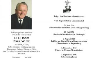 Würdigung des Verstorbenen, Pfarrer von Neunkirchen von 1960-1996, durch Pfarrgemeinderatssprecher, vorgetragen am Ende des Requiems: Sehr verehrte Geistlichkeit, liebe Familie Fuchs und Angehörige, versammelte Trauergemeinde, im Namen des Pfarrgemeinderats und der Kirchenverwaltung möchte ich stellvertretend für die katholische Pfarrgemeinde St. Dionysius Neunkirchen eine Würdigung des jahrzehntelangen Wirkens des Verstorbenen - Hochwürdigen Herrn Bischöflicher Geistlicher Rat Paul Wutz - in unserer Pfarrgemeinde geben. Aufgrund seiner enormen Lebensleistung für diese Pfarrgemeinde kann [...]