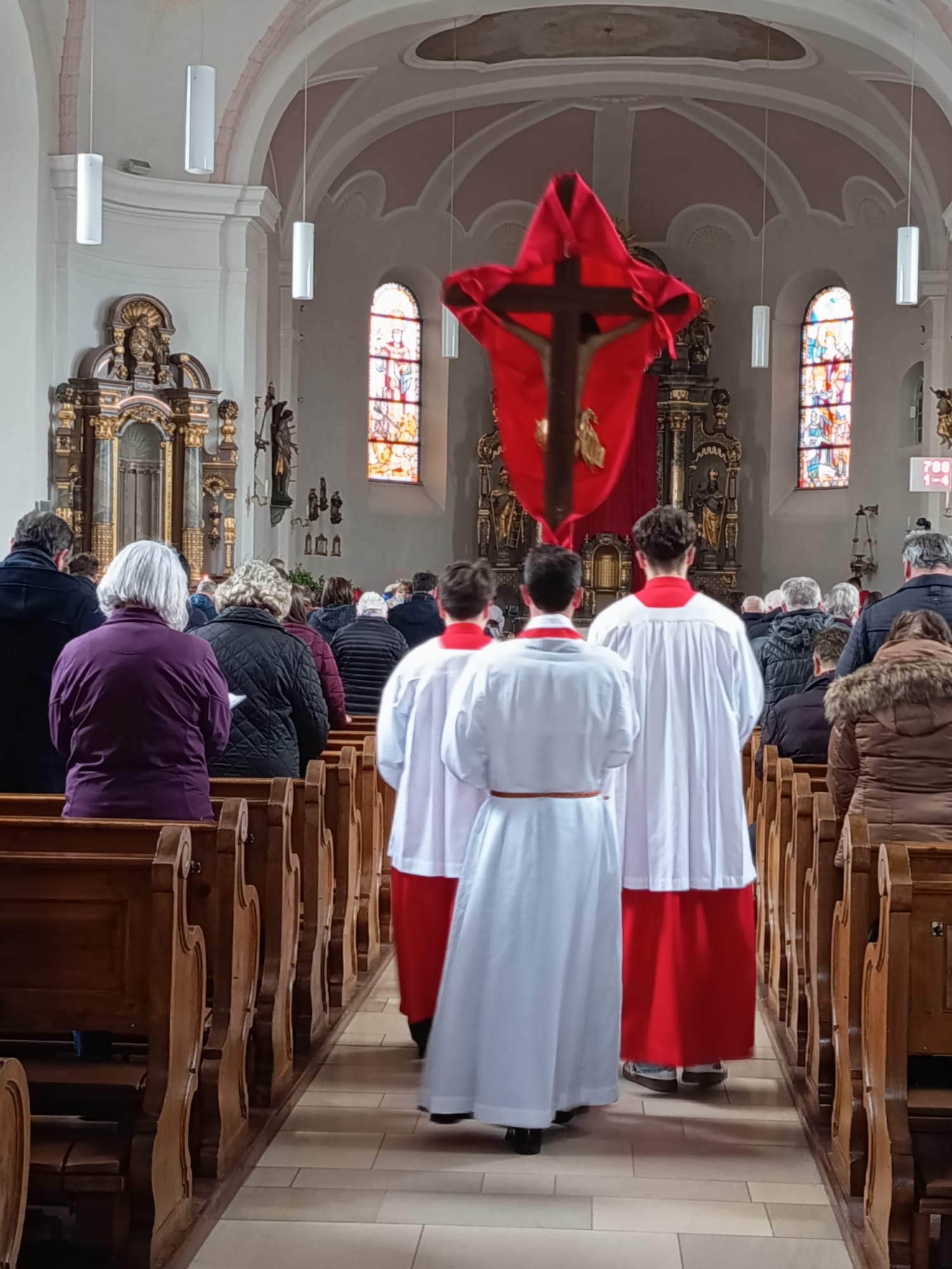 Draußen vor der Kirche standen die Ministranten mit ihren Ratschen und begrüßten lautstark die Gläubigen, die zur Mitfeier der Karfreitagsliturgie eintrafen. In völliger Stille – die Altäre waren weiterhin entblößt, der Hochaltar in Rot verhüllt – zogen die Ministranten gemeinsam mit Pfarrer Thomas Kohlhepp in die Pfarrkirche ein. Die Karfreitagsliturgie begann mit der Prostratio des liturgischen Dienstes: Pfarrer Thomas Kohlhepp und die Ministranten legten sich ausgestreckt vor dem Altarraum auf den Boden. Dieses Niederwerfen ist ein kraftvolles Symbol für Trauer, Demut und die zentrale Botschaft des christlichen Glaubens – das Opfer Jesu. Die Gemeinde kniete nieder. Nach den beiden Lesungen und dem Ruf „Christus Sieger, Christus König, Christus Herr in Ewigkeit“ hörten die Gläubigen die Passionsgeschichte. Im Anschluss wurden die sogenannten „Großen Fürbitten“ gebetet – insgesamt zehn. Als zentraler Bestandteil der Karfreitagsliturgie griffen sie die Themen Buße, Hoffnung und Fürsorge auf. Gebetet wurde unter anderem für die heilige Kirche, für den Papst und die Bischöfe, für die Gläubigen sowie für die Einheit der Christen. Dazwischen erklang der Ruf: „Beuget die Knie – erhebet euch.“ Es folgte die Kreuzerhöhung, begleitet vom dreimaligen Ruf „Seht das Holz des Kreuzes, an dem das Heil der Welt gehangen“. Anschließend verehrten die Gläubigen das Kreuz mit einer Kniebeuge oder einer Verbeugung. Unter Gemeindegesang wurde der Altar für die Kommunionausteilung bereitet. Die konsekrierten Hostien vom Gründonnerstag wurden vom Herz-Jesu-Altar geholt, zum Altar gebracht und an die Gläubigen ausgeteilt. Im Anschluss hatten die Mitfeiernden die Möglichkeit, den Einzelsegen mit dem Kreuzreliquiar zu empfangen. In aller Stille verließen die Gläubigen die Kirche. (Text: Beate Suttner/Bild: Stefan Diesenbacher)